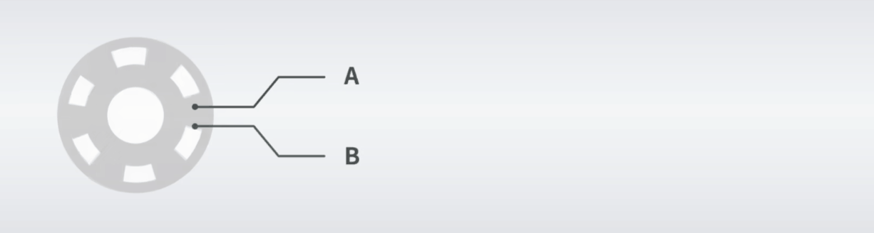 在旋转编码器内部,有一个带有均匀间隔槽孔的圆盘,圆盘与 GND 相连,另外,编码器还有另外两个金属探针 A 和 B,这些引脚将帮助我们确定旋钮的转动方向