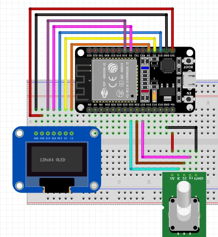 OLED 的 SCK(D0)接开发板 D18、SDA(D1)接 D5、RES 接 D15、DC 接 D2、CS 接 D4旋转编码器的 S2 引脚接开发板 D26、S1接 D27,KEY 按键没有用到,可以不接
