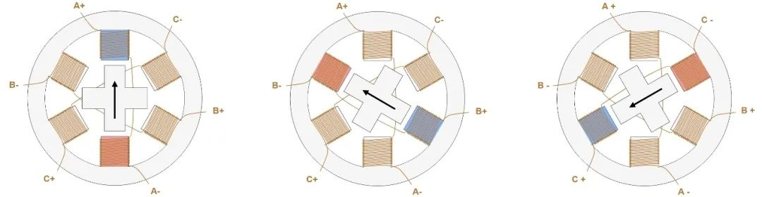 - 给一个或多个定子相位通电,线圈中通过的电流会产生磁场,而转子会与该磁场对齐