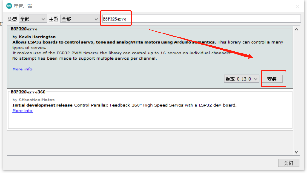 然后我们输入 ESP32Servo,点击安装即可