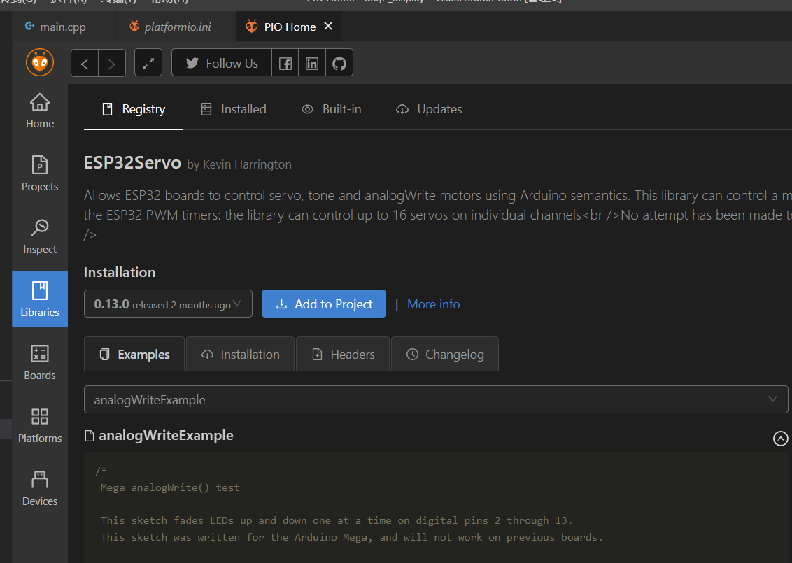 我们可以在 VSCode 的 PlatformIO 中,根据案例了解 ESP32Servo 库的使用方法