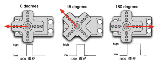 0.5-2.5ms 的 PWM 高电平部分对应控制 180 度舵机的 0-180 度,因此,对应的控制关系是这样的:
