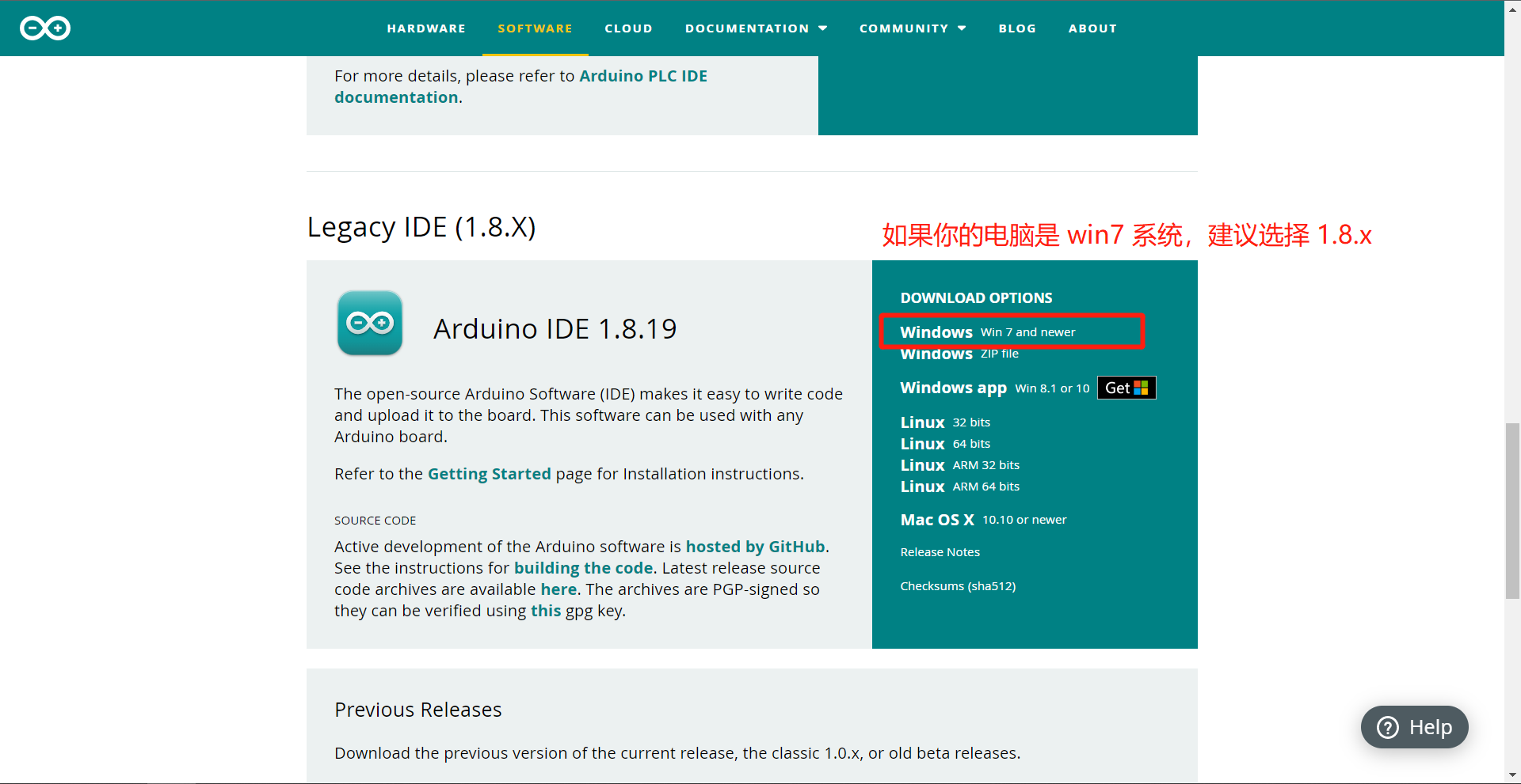 当前页面继续下拉即可找到 Arduino 1.8.19。本套教程也将采用 1.8.19 版本演示