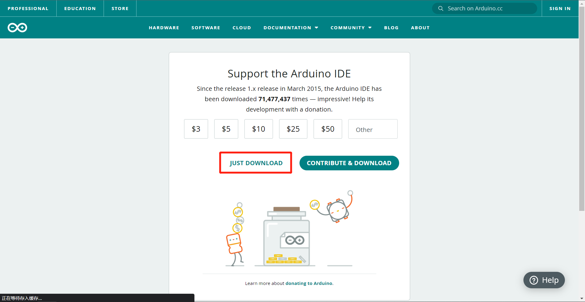 点击链接后会跳转到下载界面,如果你想要为开源软件做点贡献,可以考虑捐款,不想捐的话就点击 JUST DOWNLOAD 即可,在我们的资料包中也有 Arduino 1.8.19 与 2.0.4 的安装程序