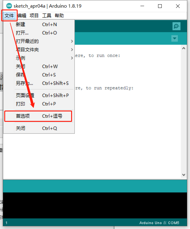 为了能够使用 Arduino IDE 开发 ESP32,你需要向 Arduino IDE 板管理器添加一个额外的源,然后安装 ESP32。我们需要先添加 ESP32 开发板附加网址。打开 文件 菜单下的 首选项