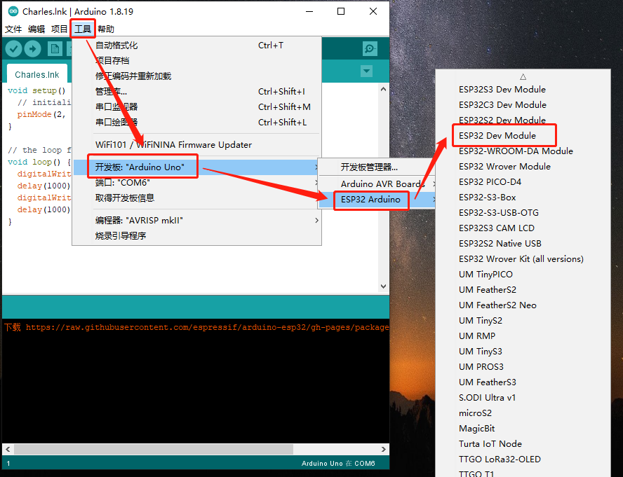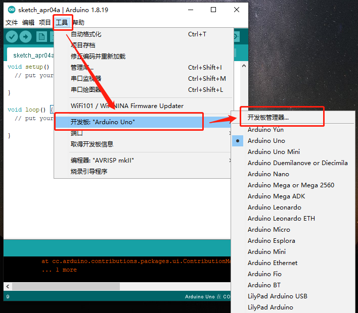 再安装 ESP32 开发板,选择 工具 菜单中的 开发板 -> 开发板管理器...