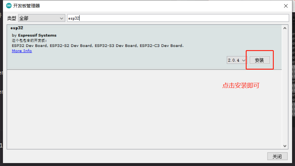 在搜索栏中搜索 esp32,可以看到 esp32 库,选择 2.0.4 版本,点击安装,等待安装完成即可
