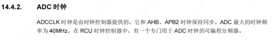 本案例使用ADC0进行操作,需要开启ADC0的时钟。 不过需要注意的是GD32F4的用户手册写出,ADC的最大时钟频率为40MHz。 因此我们使用ADC时,需要将挂载ADC的时钟总线频率分频到40MHz以下