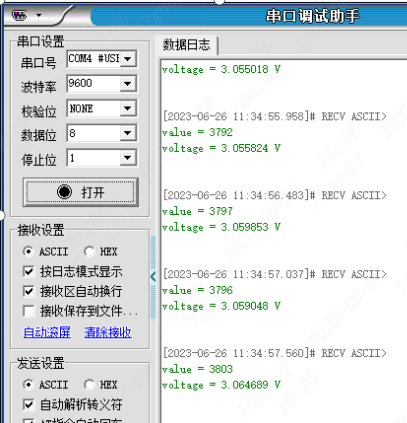 当用手当住光敏电阻后,采集到的值大约在3790左右,转换为实际电压接近3.0V