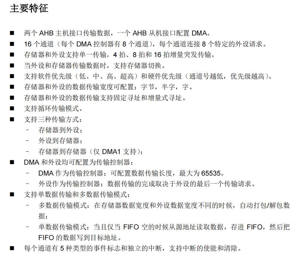 关于DMA的主要特性在用户手册的第192页,如图1-3-1所示