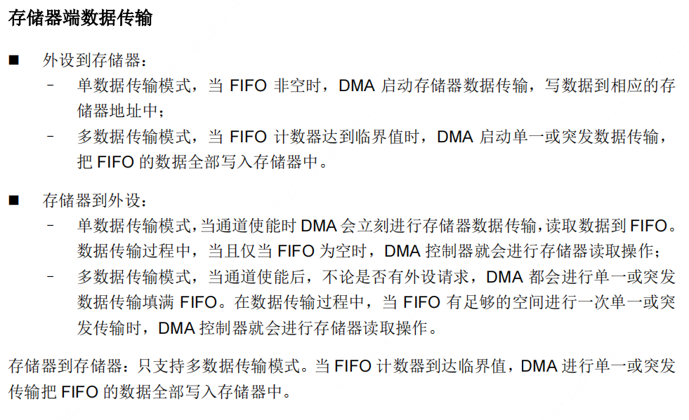 - 存储器到存储器:通过AHB外设主机接口从存储器读取数据,通过AHB存储器主机接口向存储器写入数据
