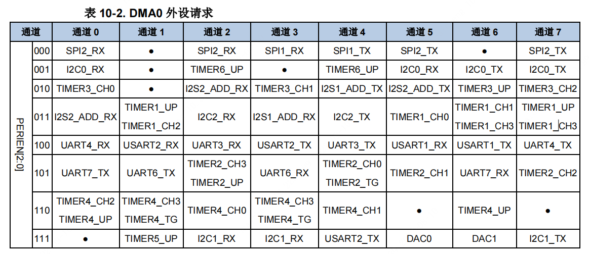 每个DMA控制器有8个通道,每个通道有多个外设请求。DMA0和DMA1的外设请求映射分别如表10-2与表10-3所示