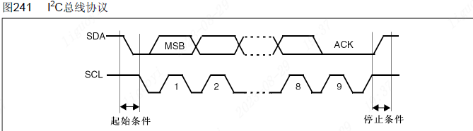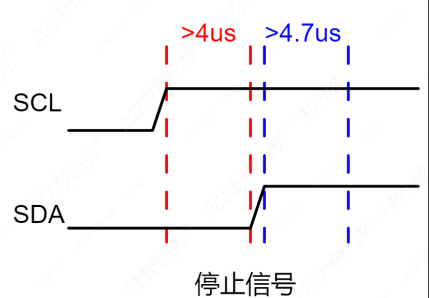 停止信号:SCL在高电平的状态下,SDA的电平由低转高,表示结束这次通信。主设备在发送停止信号后不能再向从设备发送任何数据,除非再次发送起始信号