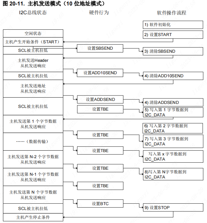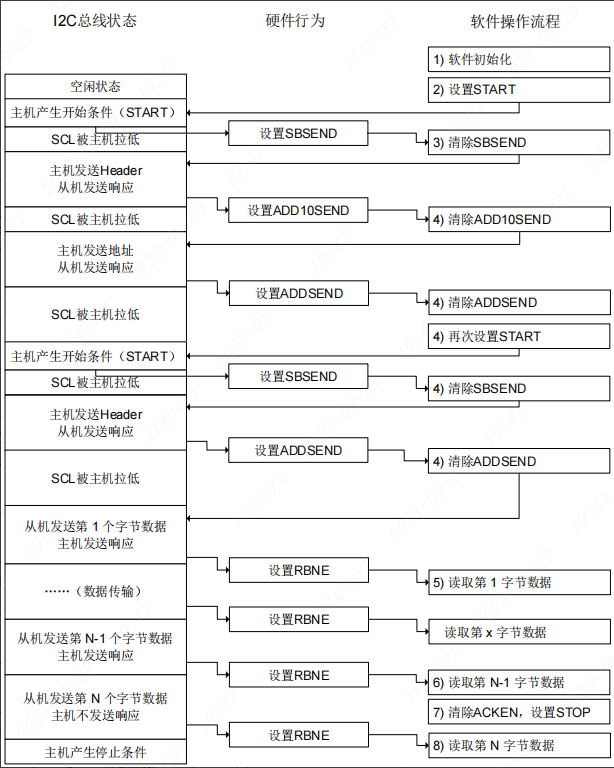 根据图2-2-1所示,第一步至第四步的清除ADDSEND与硬件I2C发送流程一致,这里不再说明,我们从图2-2-1第四步中的再次设置START开始