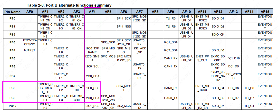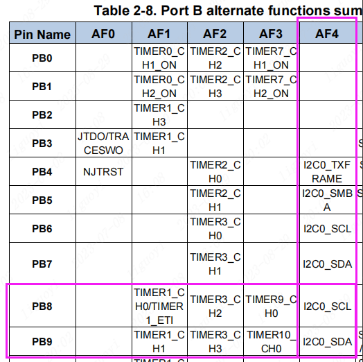 数据手册中写明,PB8与PB9在复用线AF4中有I2C0的复用功能,PB8为I2C0的时钟线SCL,PB9为I2C0的数据线SDA