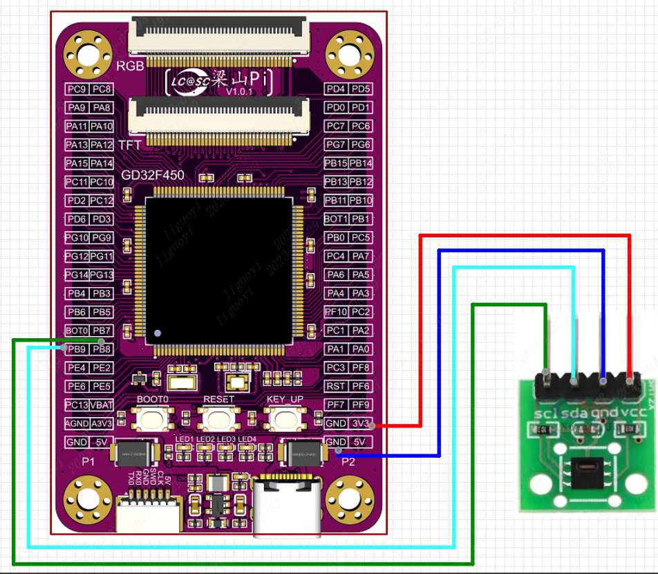因SHT20温湿度传感器采用的是标准的IIC接口,我们可以使用软件I2C和硬件I2C的方式与其通信。只要是通用输入输出(GPIO)的引脚就可以使用软件I2C, 而硬件I2C需要使用到指定引脚才可使用。为了讲解软硬件I2C的两个案例,选择了PB9(I2C0_SDA)和PB8(I2C0_SCL)作为通信引脚