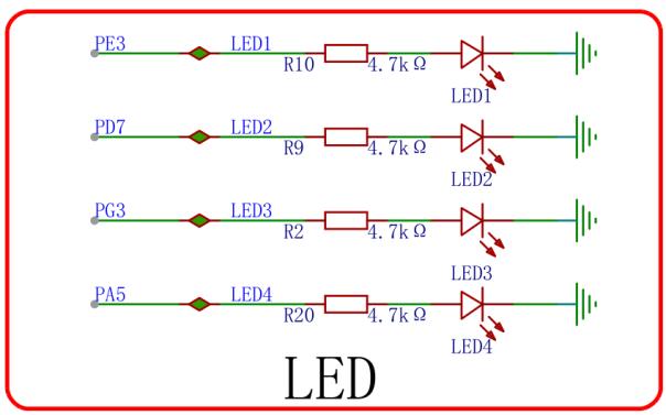 通过上面的原理图可以了解到,LED灯的负极接到了电源地,LED灯的正极连接到了单片机的GPIO口上,通过LED灯的驱动原理,只需要将GPIO配置为高电平即可点亮LED灯。 对应LED2就是使能PD7口输出高电平即可点亮LED2。LED1、LED3和LED4也是类似