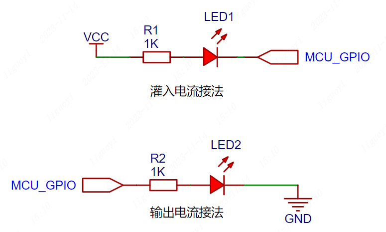 - 灌入电流指的是LED的供电电流是由外部提供电流,将电流灌入我们的MCU;风险是当外部电源出现变化时,会导致MCU的引脚烧坏。
