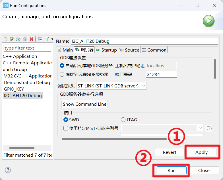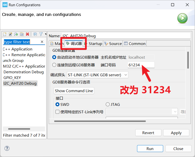 📓常见问题【下载失败】TCP端口问题报错 Port 61234 被占用 TCP 端口被占用 解决方法: 1、打开 Run Configuration 2、将端口号改为 31234 3、点击 Apply,再点 Run,就能下载程序了