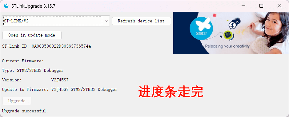 ST-Link device lost when exiting upgrade mode只要升级进度条走完就可以了,可以忽略这个提示