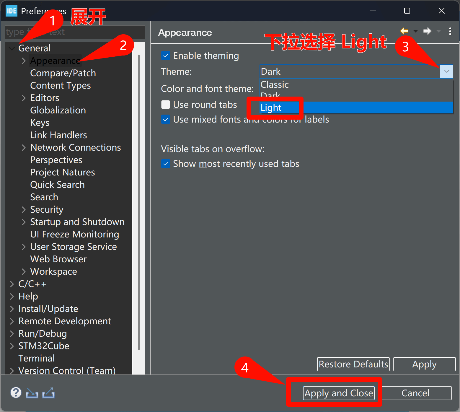 📓常见问题【软件】如何更换浅色主题更换浅色主题 根据以下步骤,即可跟教程一样白底浅色界面 1️⃣ 在软件顶部的菜单栏,打开设置页面 2️⃣ 按图片 1-2-3-4 步骤操作 3️⃣ 点 Restart 重启软件,主题就变成浅色啦