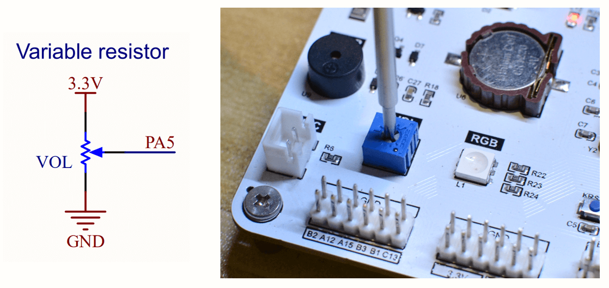 程序会连续读取 PA5 的输入电压值,而 PA5 的电压值是由电位器 VOL 决定的,使用螺丝刀调节学习板上的电位器,即可观察到对应的数据变化。