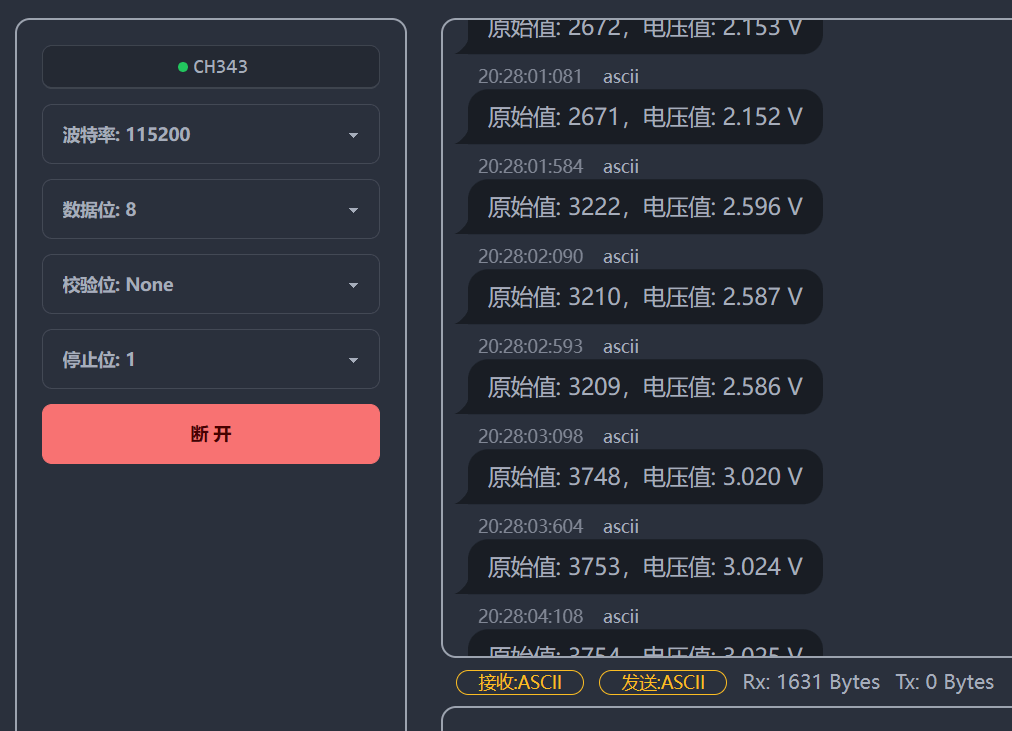 - 打开 小智精灵 串口助手 在线串口调试助手,点击“选择串口”,选择 USB Single Serial,即可收到 ADC 转换结果,如图所示