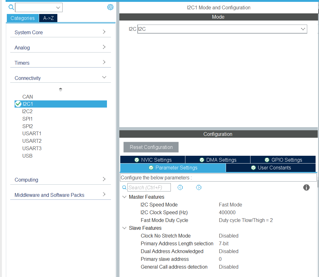 I2C1配置页,将 I2C 模式选择为I2C,并在下方Parameter Settings将I2C Speed Mode选择为Fast Mode
