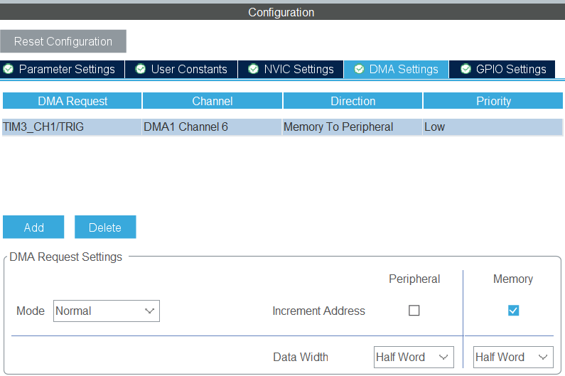Configuration -> DMA Settings,点击 Add 新增一个通道