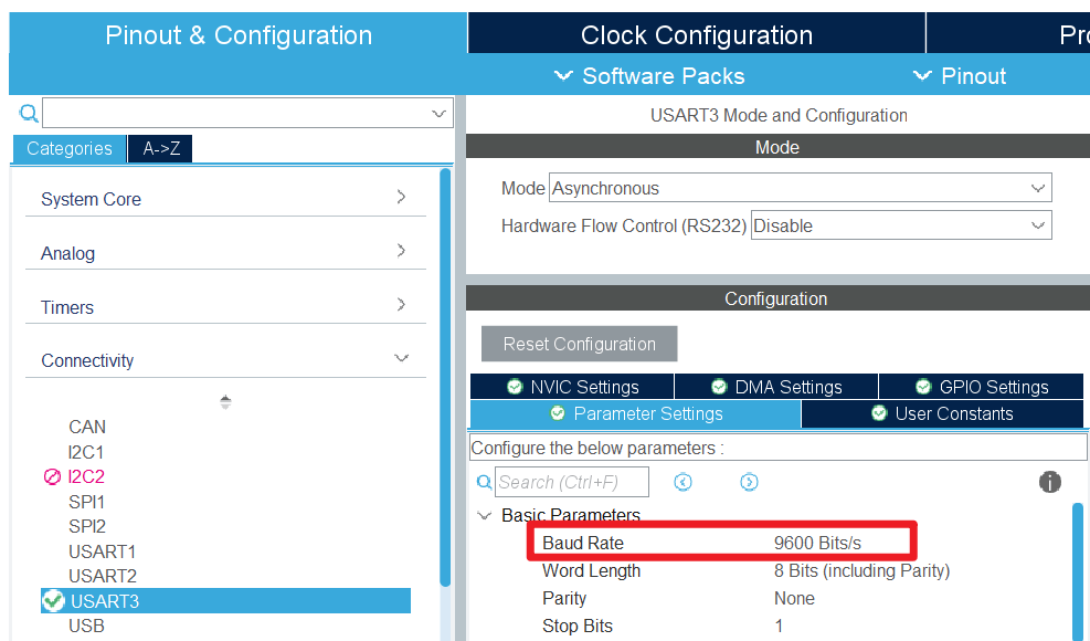 更改波特率:在 USART3 -> Configuration -> Parameter Settings 标签卡中,将 Baud Rate 更改为 9600