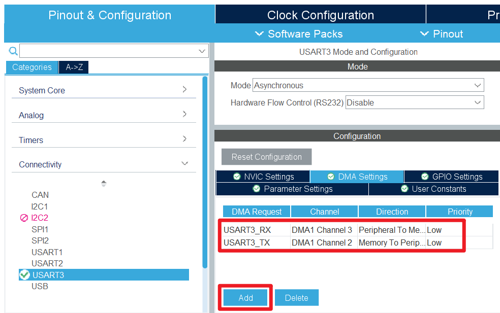 - 添加 DMA 通道:在 USART3 -> Configuration -> DMA Settings 标签卡中,点击 Add 按钮,分别添加 USART3_RX 和 USART3_TX 的 DMA 通道