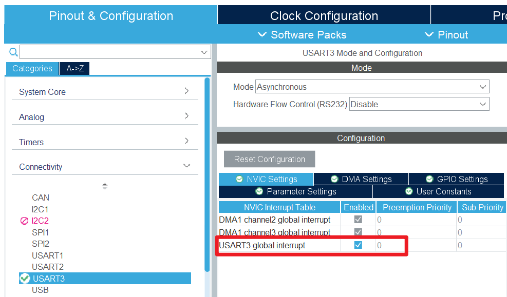 - 使能串口中断:在 USART3 -> Configuration -> NVIC Settings 标签卡中,勾选 USART3 global interrupt 的 Enable