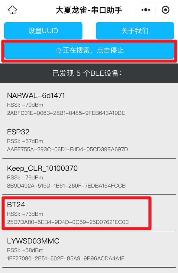 - 打开微信小程序【大夏无线传输助手】,点击【搜索】,找到 BT24,点击进行连接