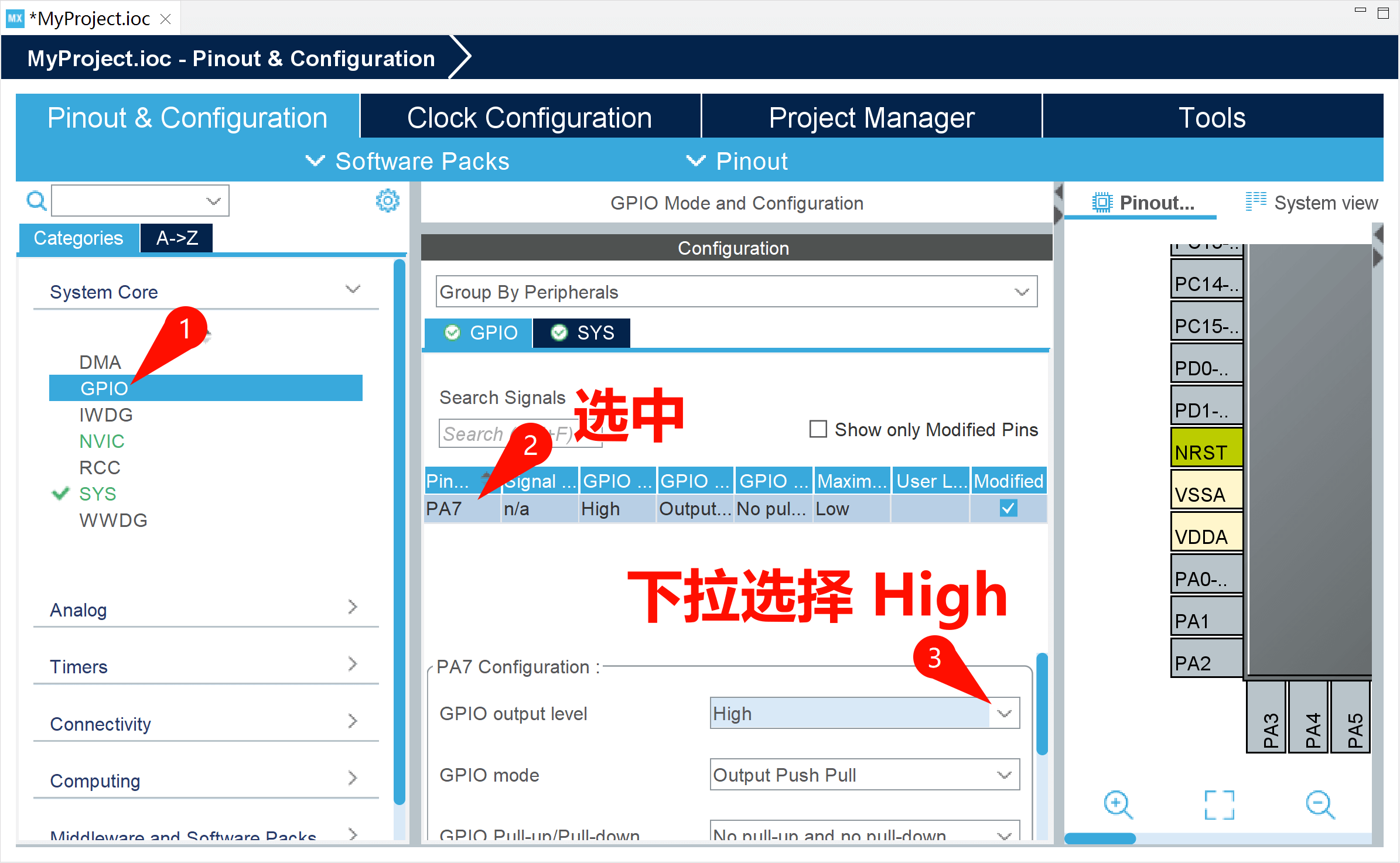 将 PA7 配置为输出引脚(PA7 连接到学习板上的绿色 LED)