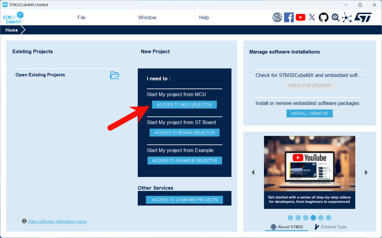 1️⃣ 在 CubeMX 软件中选择 ACCESS TO MCU SELECTOR